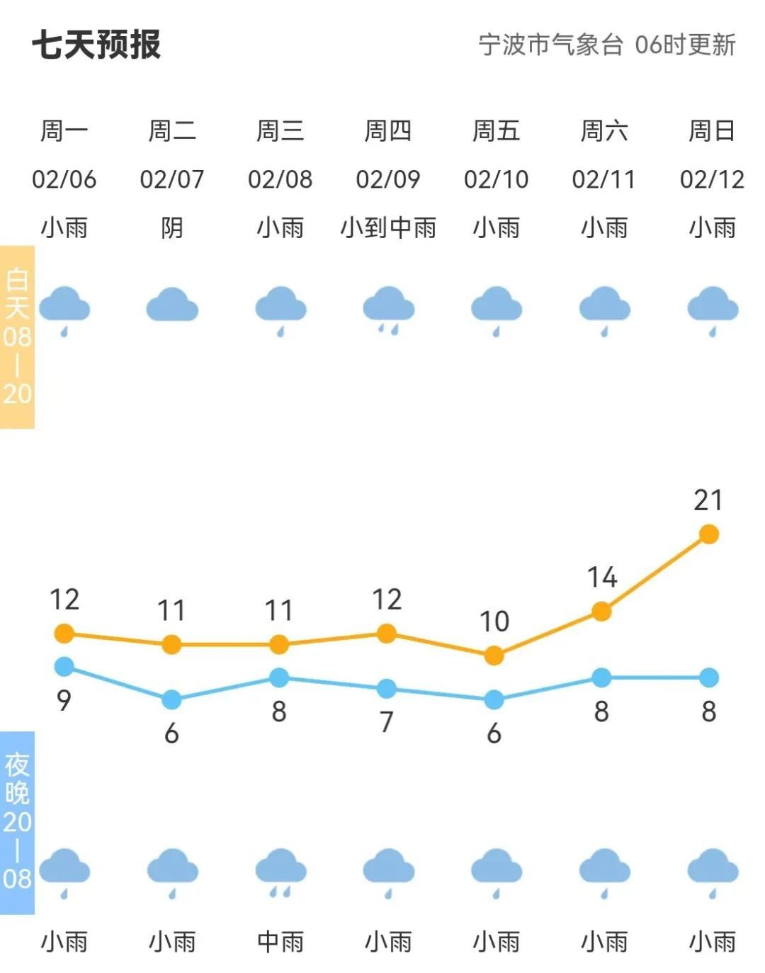 未来一周甬城都是阴阴雨雨的天气,阳光踪迹难觅,气温昼夜温差小,起伏不大。