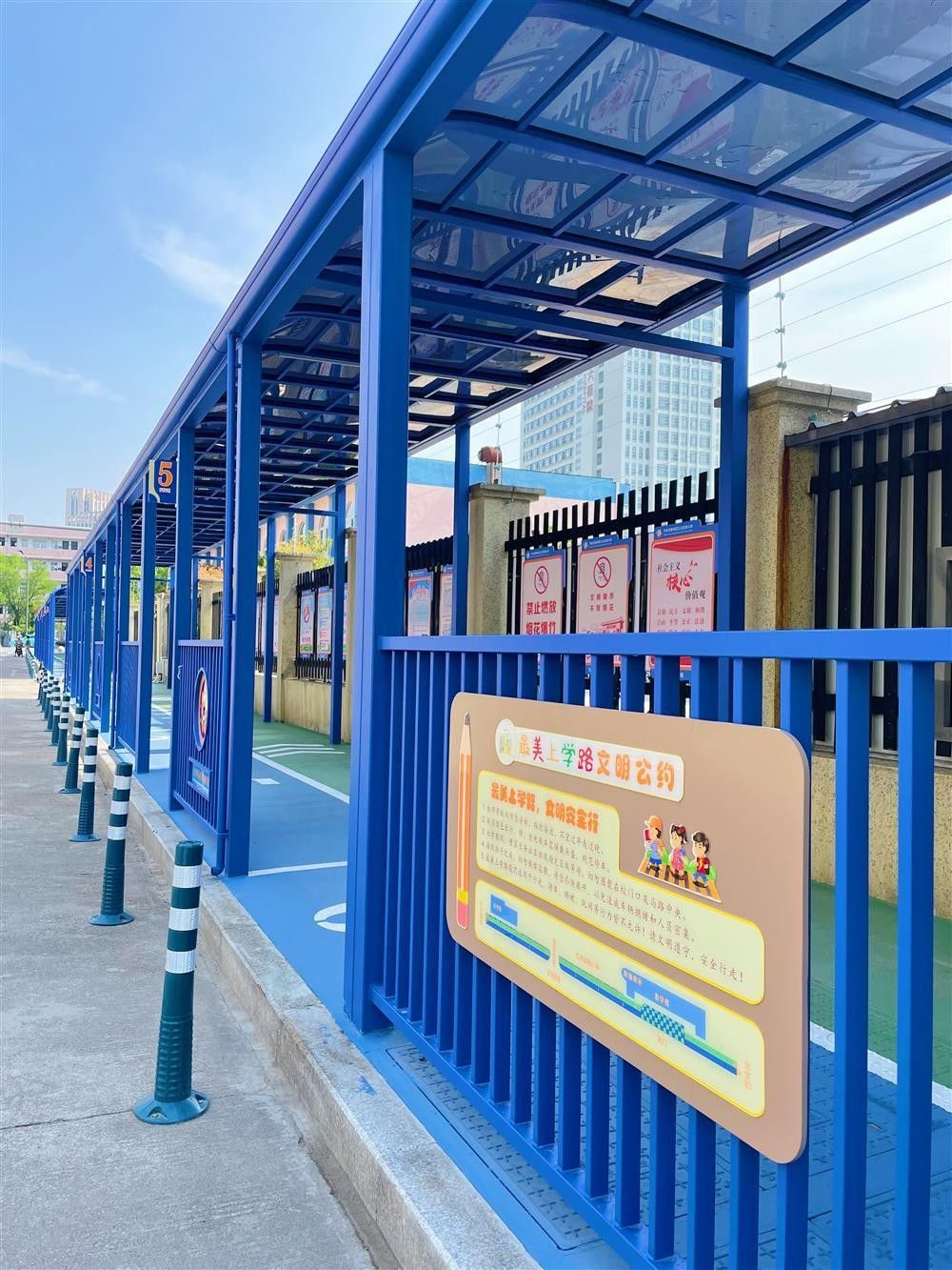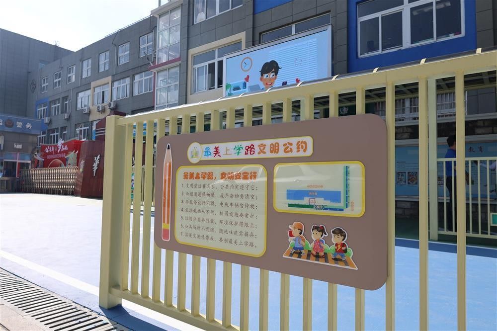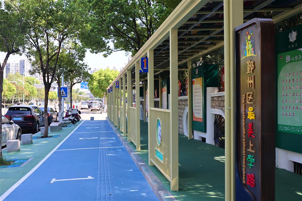 除了各学校的特色文化,“最美上学路”也探索出了更多样的功能,“文明校园”等宣传标语在这条路上一一落脚安家,也许以后还能在连廊里添置小屏幕,播放教育视频。“这是一条解决民生实事之路,也是一条提升城市文明形象之路,更是未成年人思想道德建设的宣传之路。”张莺说。