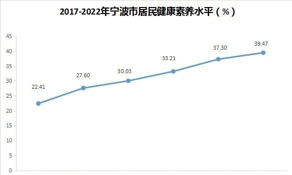 2022年宁波市居民健康素养监测覆盖全市10个区(县、市),调查对象为15~69岁常住人口,完成有效问卷6400份。数据显示,我市居民健康素养水平逐年稳步提升,从2017年的22.41%上升到了2022年的39.47%。