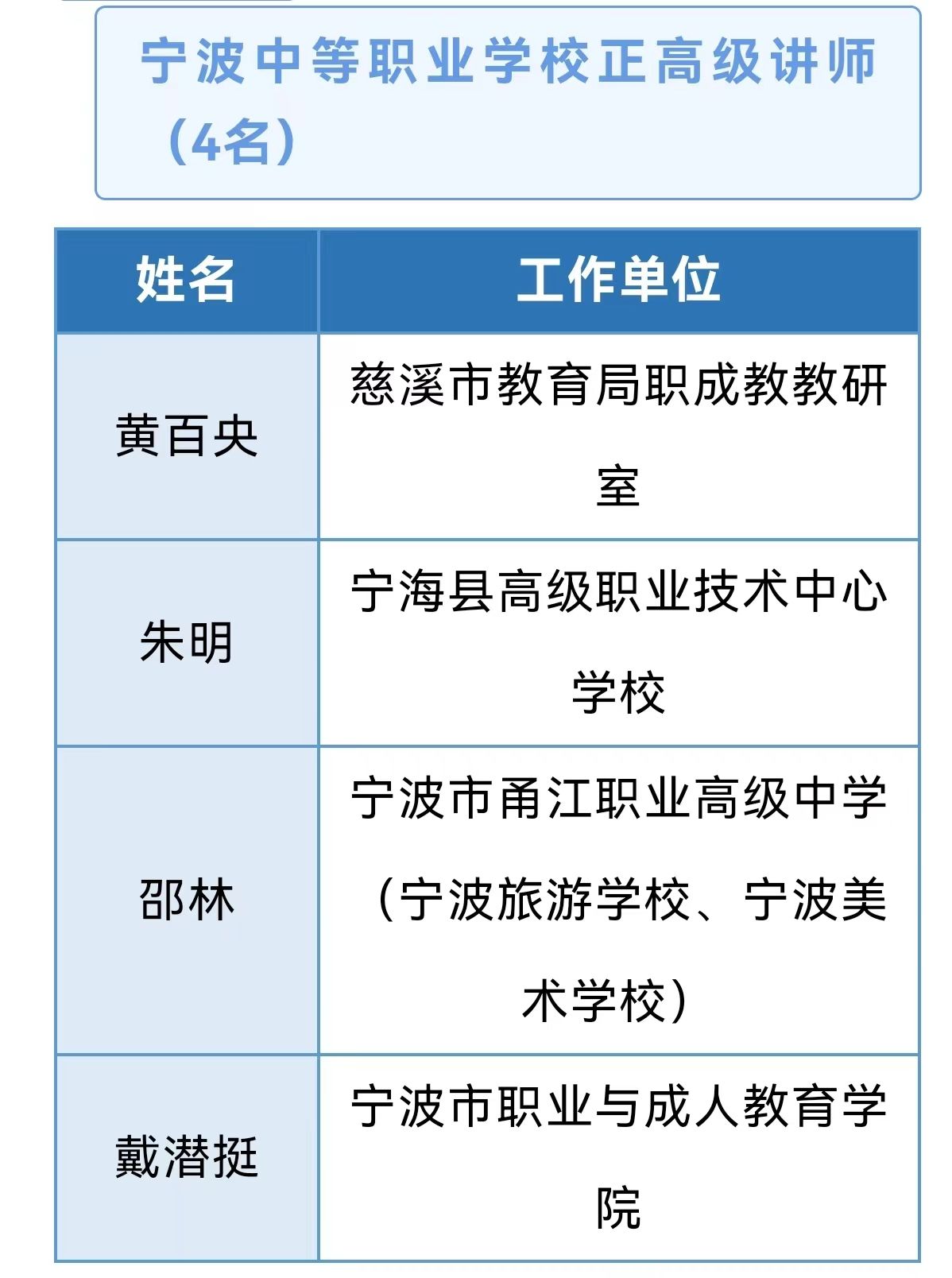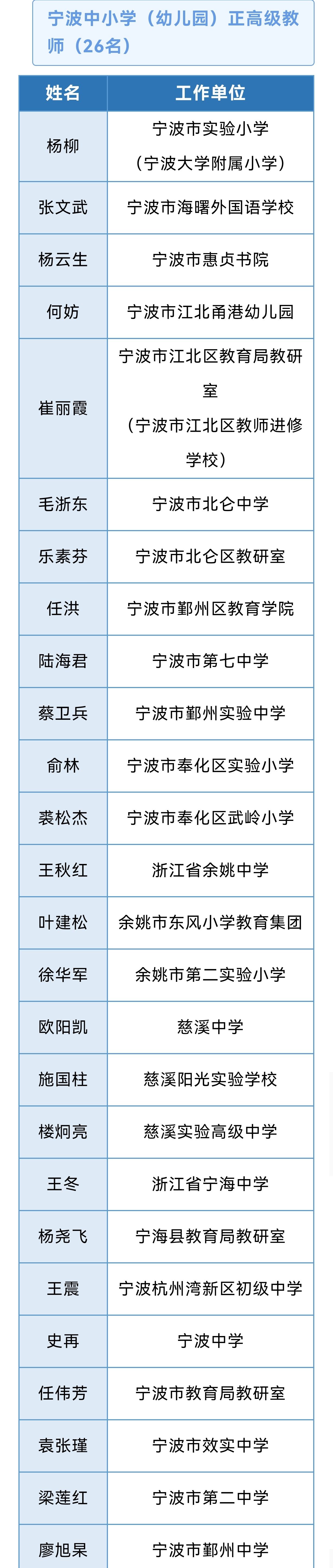 日前,浙江省教育厅公示了2022浙江省中小学(幼儿园)正高级教师、中等职业学校正高级讲师人员名单。其中,中小学(幼儿园)正高级教师名单,宁波有26名老师上榜;中等职业学校正高级讲师名单,宁波有4名老师上榜。一起来看↓