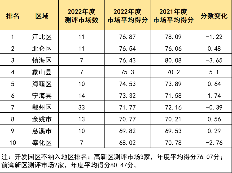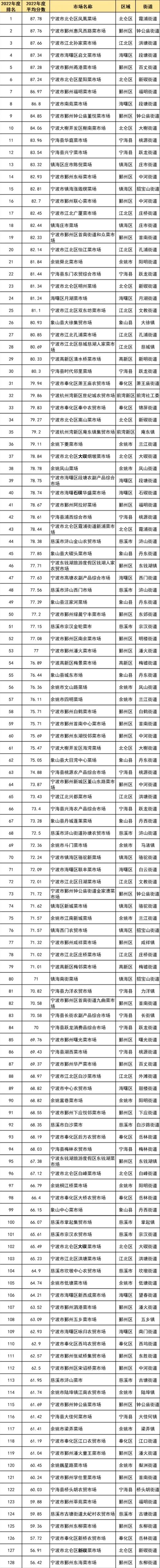 2022年度平均得分位居前三的市场是北仑区凤凰菜场(87.78分)、鄞州区惠风西路菜市场(87.76分)、江北区孙家菜市场(87.66分)。 排名前十的市场中,鄞州区4家,北仑区3家,海曙区2家,江北区1家;排名后三的市场是鄞州东海菜市场(56.42分)、北仑区新碶菜市场(56.91分)、奉化区新桥农贸市场(57.72分)。排名后十的市场中,鄞州区5家,北仑区、奉化区、余姚市、慈溪市、宁海县各1家。
