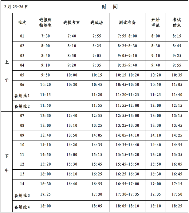 2月25日至26日,上午8:00开始,下午13:00开始,按批考试。每天分14个批次,每个批次测试时间为30分钟,学生实际操作时间为15分钟,具体见下表。