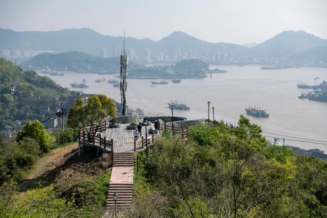 立于最外侧观景台眺望,山脚下的楼房鳞次栉比,港口船影绰绰,远处群山环抱。有山有海有人,充满生活气息的海港景致,令人流连。