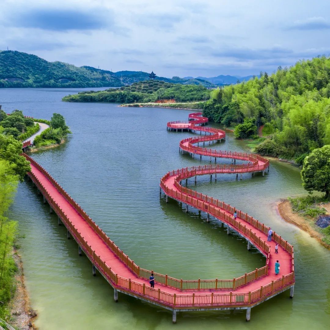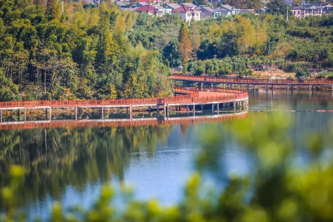 云湖绿道位于慈城镇北部山区英雄水库的北岸,其中1公里为亲水栈桥,其他路段为红色透水混凝土路面和夜间发光路面。