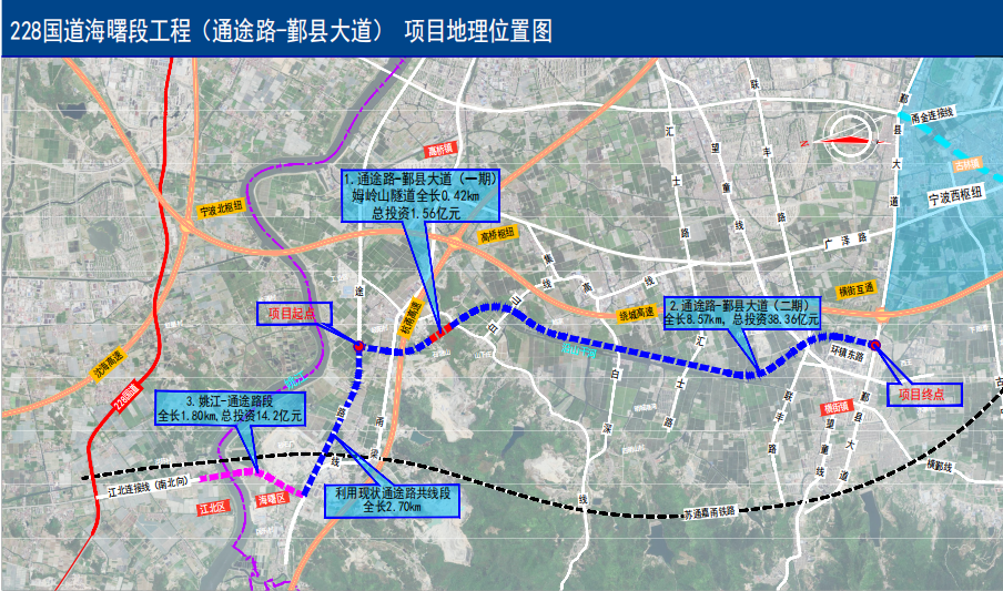 228国道海曙段工程(通途路-鄞县大道)起于通途西路与甬通公路交叉口,于沿山干河东侧布设,过汇士路后折向东南,与鄞县大道相接。全长8.99公里,采用双向六车道,一级公路标准建设,设计速度为80公里/小时,标准断面宽度为34米,总投资约40亿元。