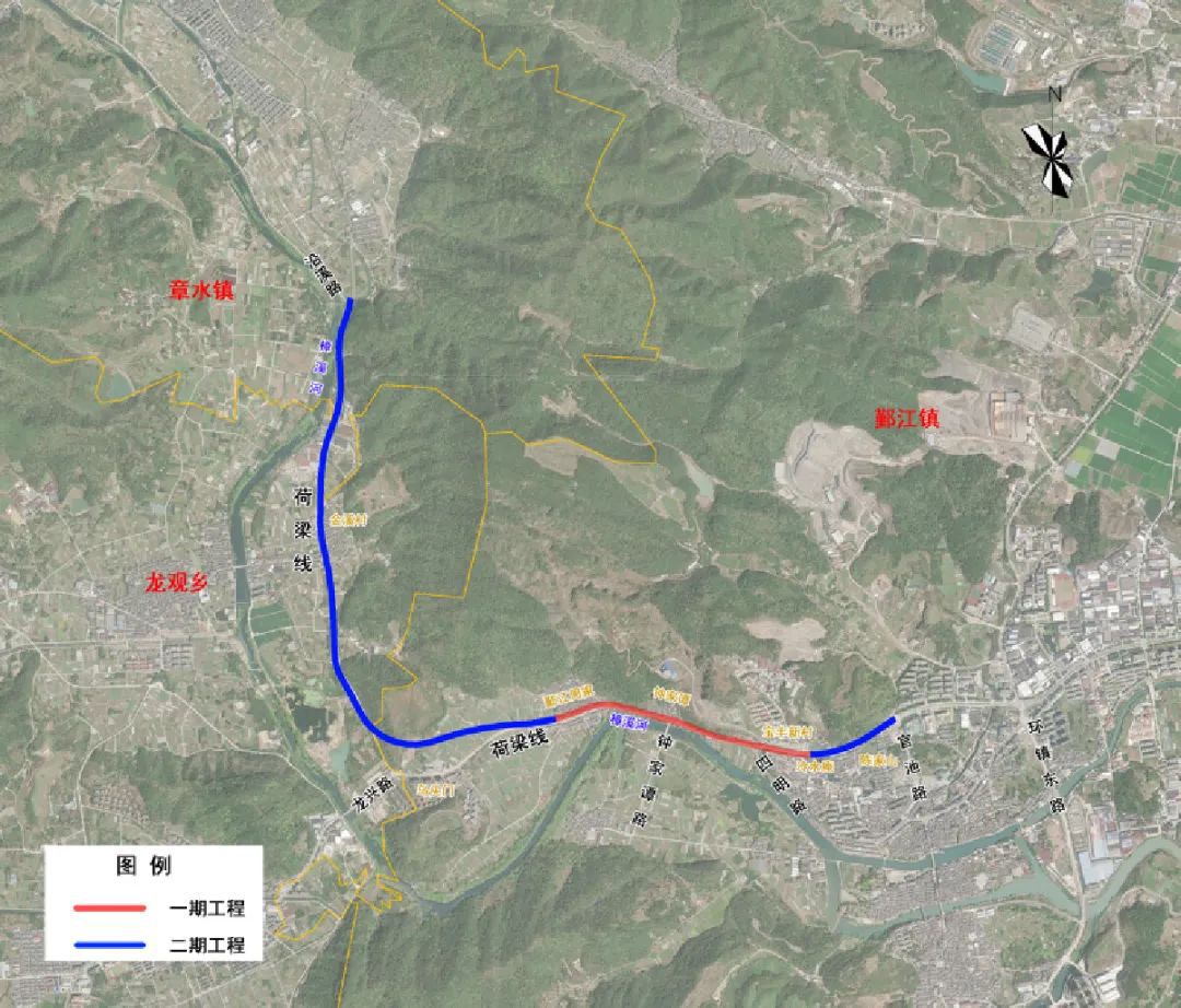 S309鄞州至开化公路荷梁线(鄞江—章水)公路二期工程西段西起章水沿溪路,东至鄞江周家村,东段西起鄞江冷水庵,东至鄞江官池路,全长约3.68公里,实施标准断面宽度20.5-30米,道路等级为一级公路,设计速度60km/h,由宁波市海曙区交通投资建设有限公司拟建。