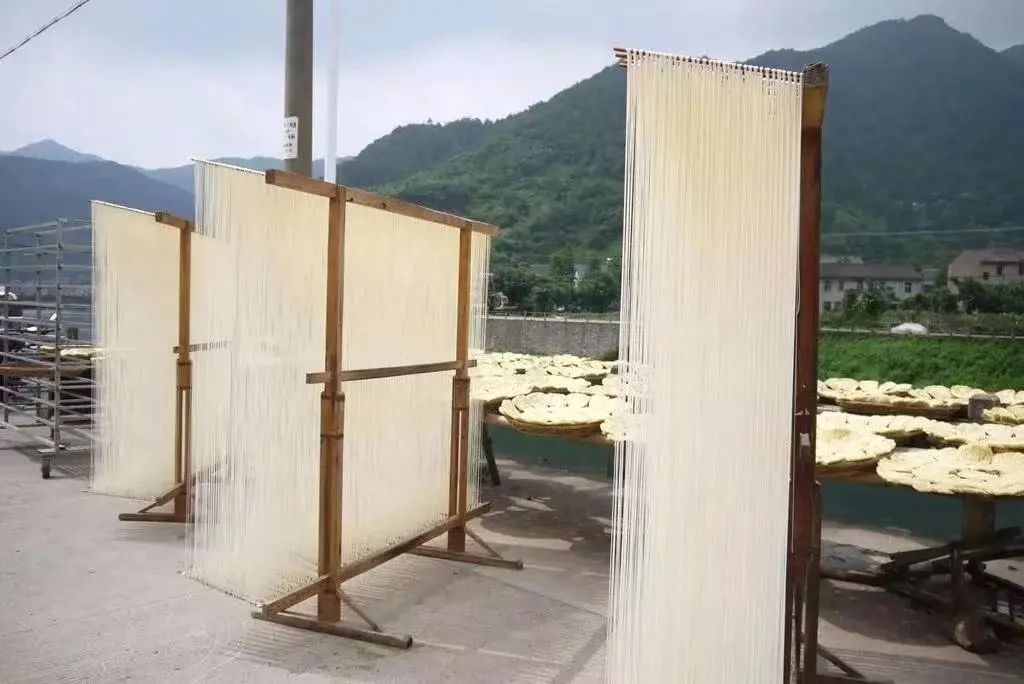 像竖琴一样的面条就是宁波人过生日、坐月子常吃的长面,也叫坠面、冬面。这种面添加有盐卤,只能依靠手工制作,把面条慢慢地往下拉扯,因此也叫坠面。以前在冬天制作,也叫冬面。