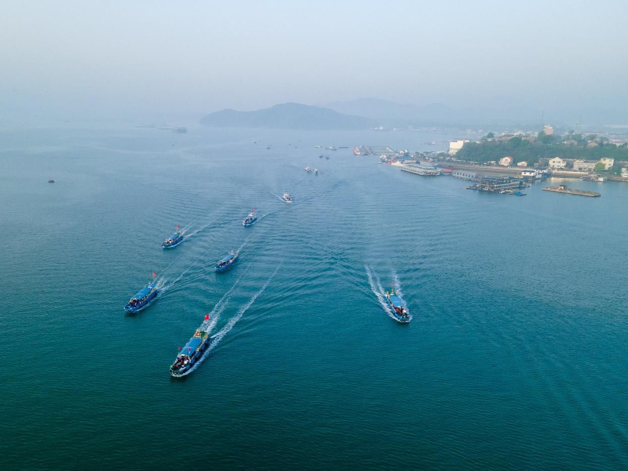 宁海湾的早晨,风平浪静,海天一色。随着长长的鸣笛声,停靠于强蛟镇峡山码头的10余艘钓船齐发,在海湾上划出一道道壮丽的弧线,88名参赛选手乘风破浪奔赴各个钓点开始比赛。
