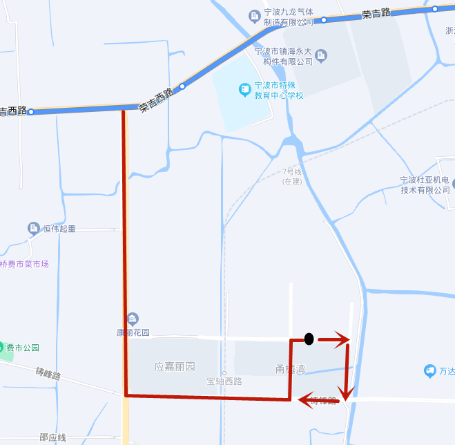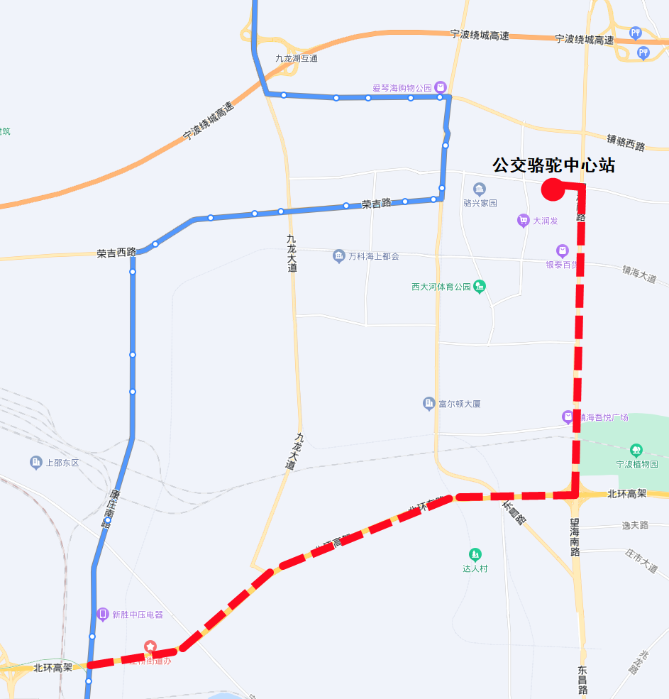 1、改道走向:荣吉西路康庄北路口后改走康庄北路、铸锋路、联群路、应嘉路至甬樾湾。