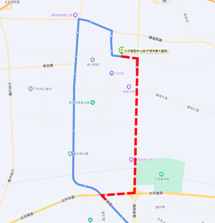 2、撤销汇水路、长骆路、镇海大道、九龙大道、通和东路、部分通园北路走向及小骆花园南↑、小骆花园西↓、九龙大道镇海大道口、宁波中鑫(杜亚机电)、埃美柯、通园北路汇湖路口(久兴医疗)停靠站点。