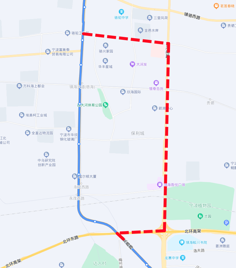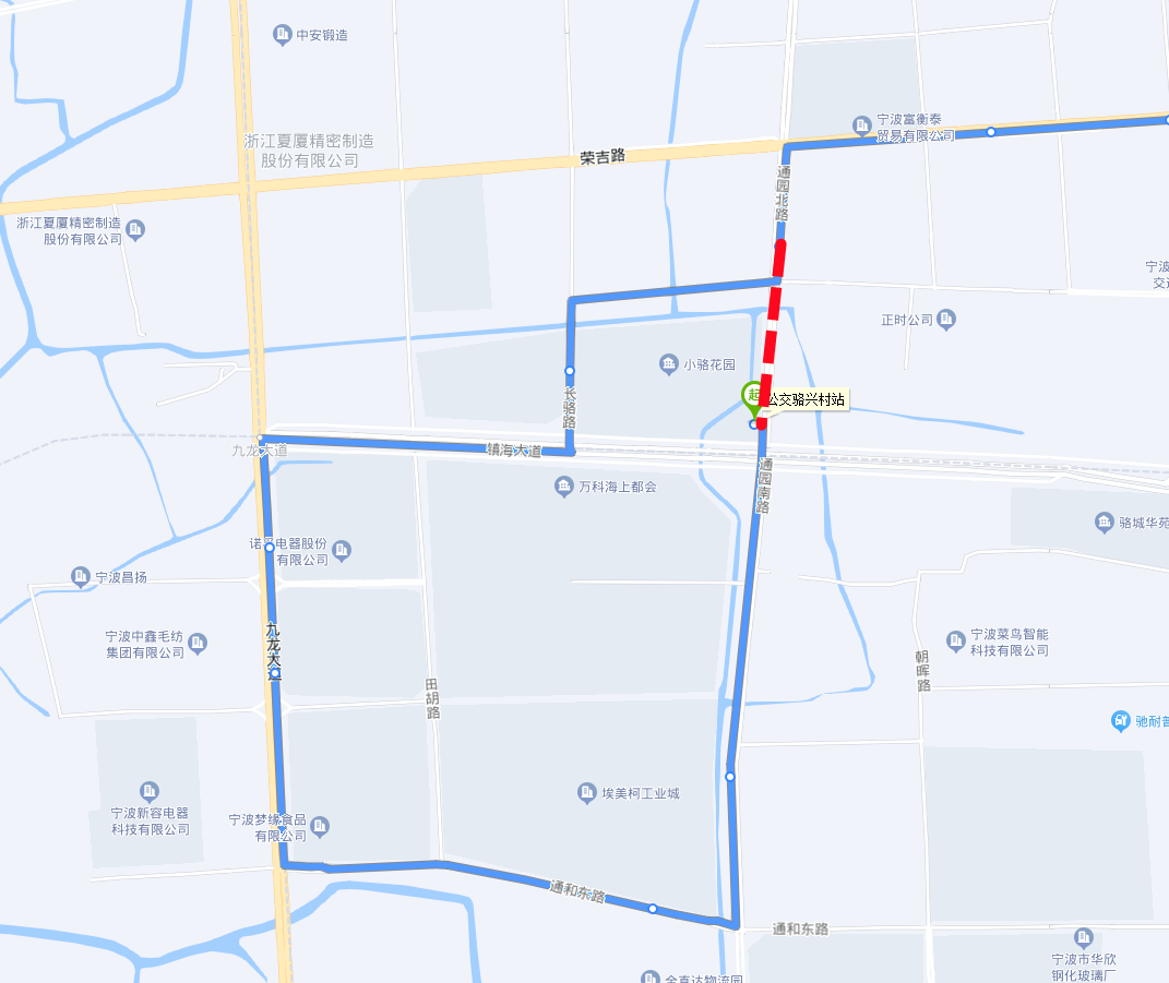 1、改道走向:通园北路汇水路口后双向改走通园北路至公交骆兴村站。