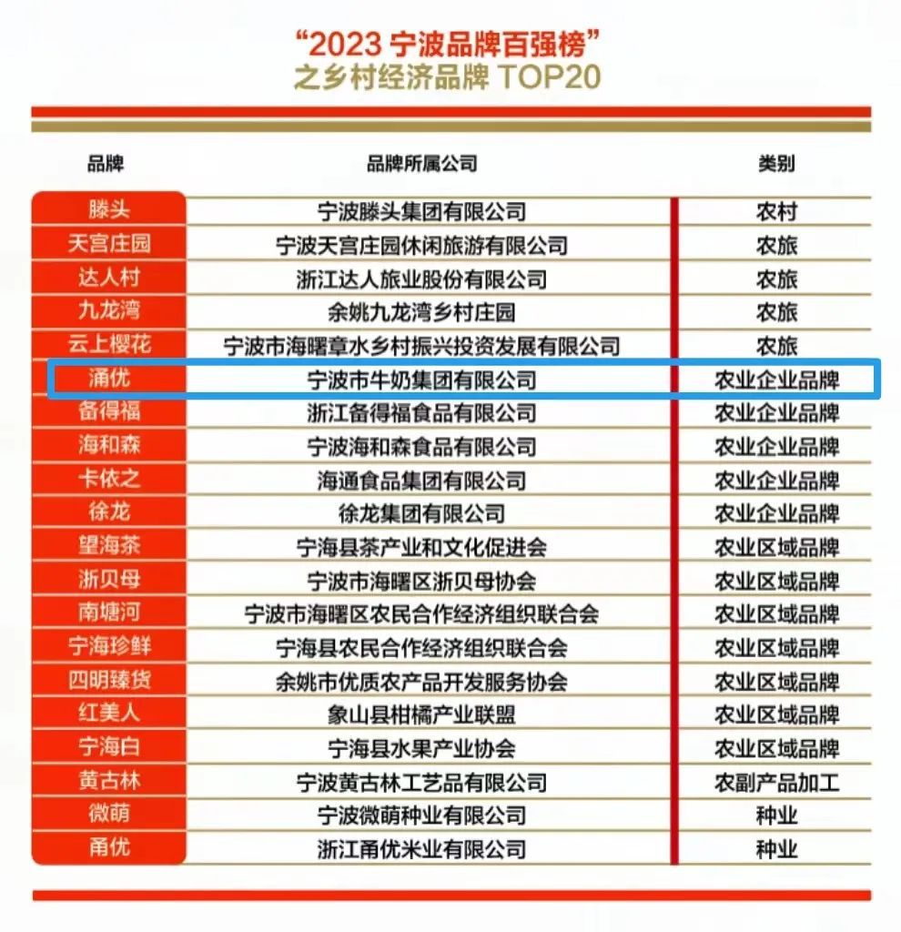 宁波牛奶集团旗下的“涌优”品牌,本次还荣膺2023宁波品牌百强榜之乡村经济品牌TOP20。
