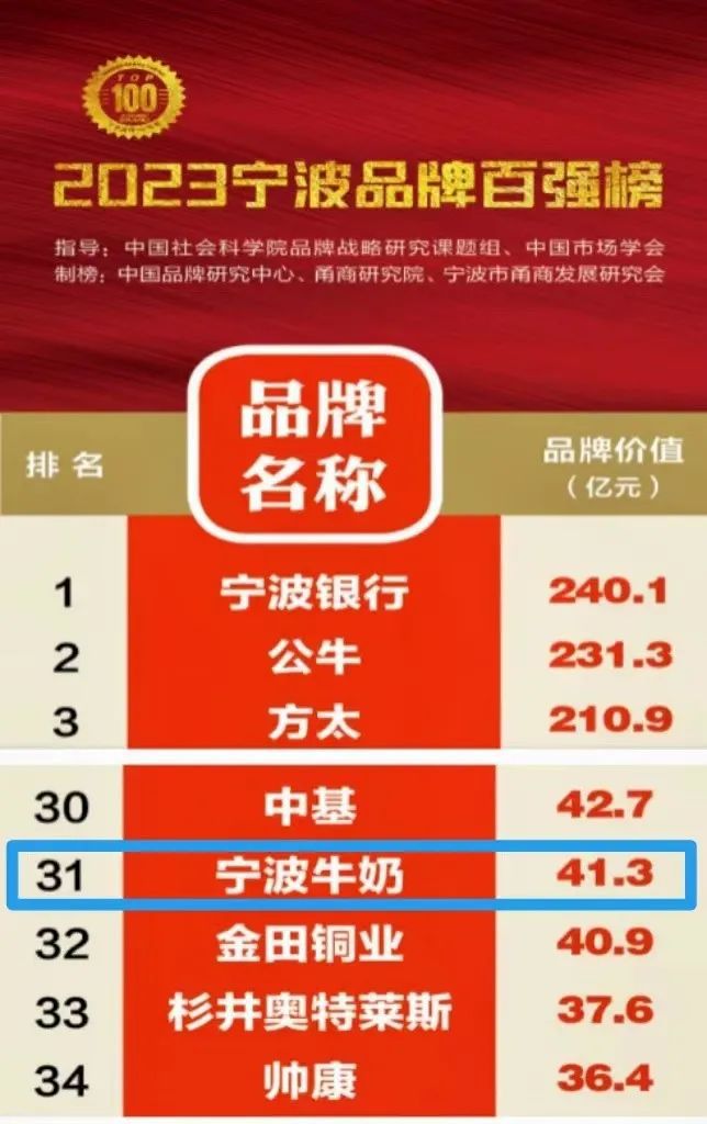 据查询此前的宁波品牌百强榜单,宁波牛奶也是连年上榜。从2013年的排名第90位、品牌价值4.8亿元,2014年的第78位、品牌价值9.4亿元,2015年第73位、品牌价值9.8亿元, 2016年第53位,品牌价值12亿元,2018年第43位、品牌价值22亿元,2019年第38位、品牌价值33.6亿元,2020年第37位、品牌价值35.7亿元,2021制造业第27位、品牌价值37.2亿元,到2023第31位、品牌价值41.3亿元。品牌价值逐年上升。连续多年入榜,是社会各界对宁波牛奶品牌的认可及肯定的一种体现。