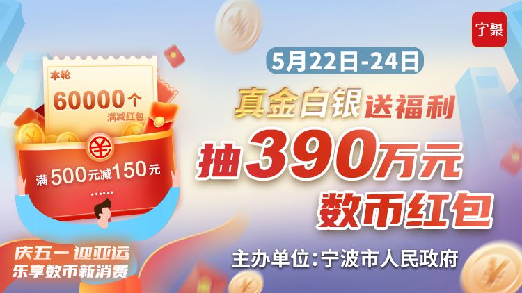 由宁波市人民政府主办的“庆五一迎亚运·乐享数币新消费”宁波市数币消费红包发放活动,第三轮报名,进入倒计时!