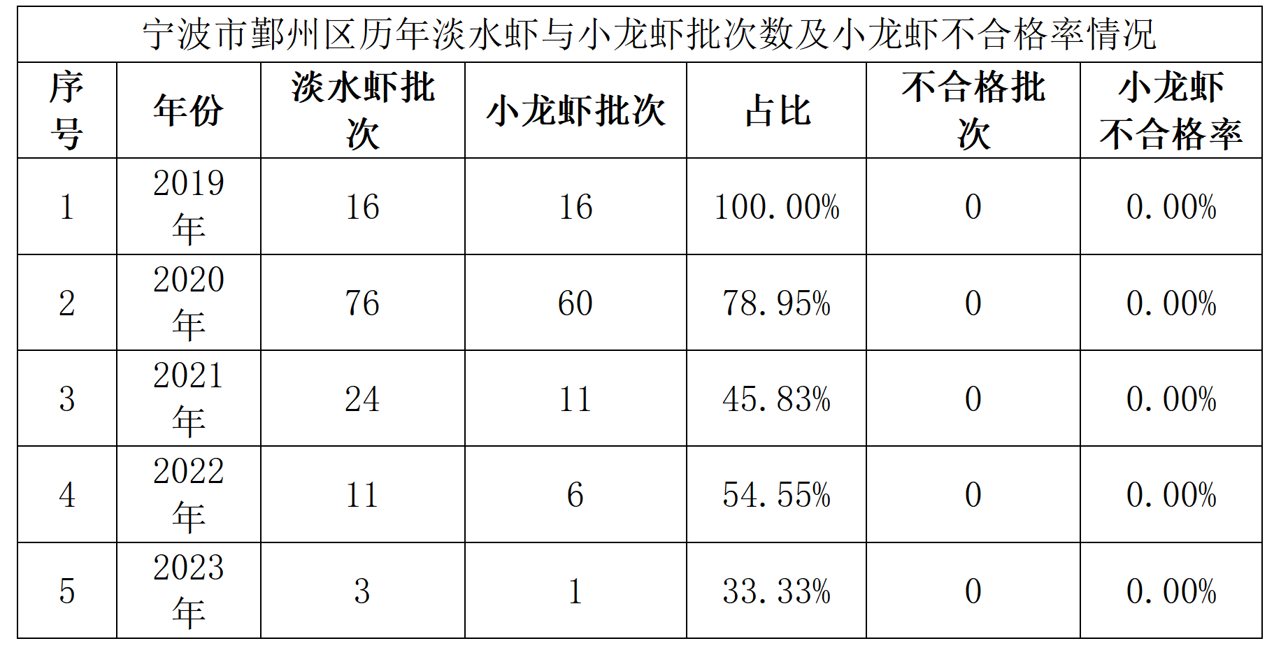 从2022年全省抽检情况来看,淡水虾不合格主要集中在恩诺沙星项目。而从鄞州区历年的抽检数据来看,2019年起在抽检淡水虾时就已经开始及时覆盖小龙虾的抽检,2020年加大了抽检力度,不过均未发现小龙虾不合格样品。