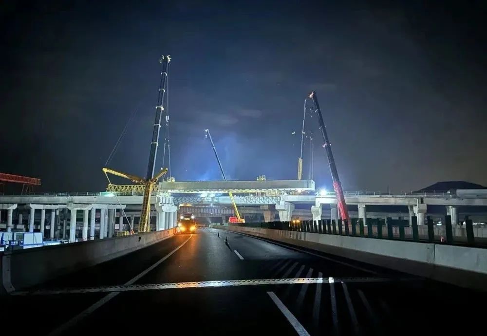 塘溪枢纽共有6处上跨甬莞高速,钢混叠合梁长度为40米与45米,这种桥梁以其轻质、高强、高刚性、耐用等特点广受青睐。TJ-4标项目部施工团队在面对复杂的桥梁结构、狭小的施工空间以及高速路面的限制时,采用先进施工技术,制定科学施工方案,历时近6个月,最终圆满完成施工任务,为这条高速年内建成通车奠定了坚实基础。