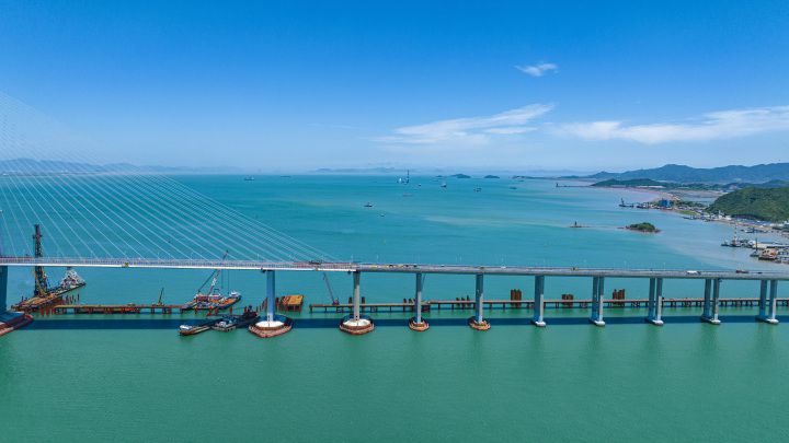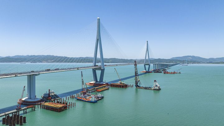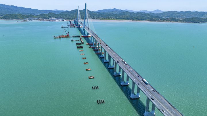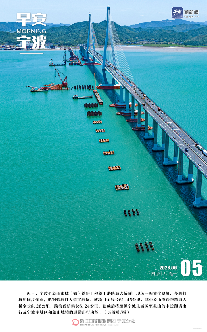 近日,宁波至象山市域(郊)铁路工程象山港跨海大桥项目现场一派繁忙景象,多艘打桩船同步作业,把钢管桩打入指定桩位。该项目全线长61.45公里,其中象山港铁路跨海大桥全长8.26公里,跨海段桥梁长6.24公里,建成后将承担宁波主城区至象山的中长距离出行及宁波主城区和象山城镇的通勤出行功能。