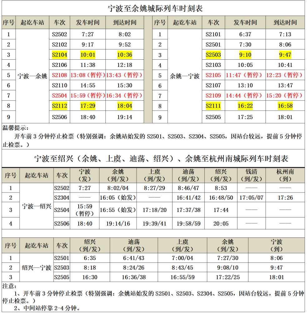 截至目前,仍有宁波至余姚S2108次、S2504次及余姚至宁波S2105次、S2109次因施工停运。