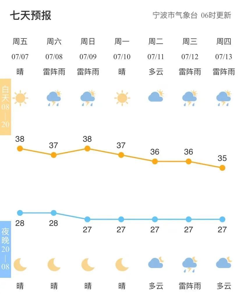 今天上午,宁波全域发布高温橙色预警:受副热带高压影响,预计今天我市最高气温可达38℃以上,请做好防暑降温工作。
