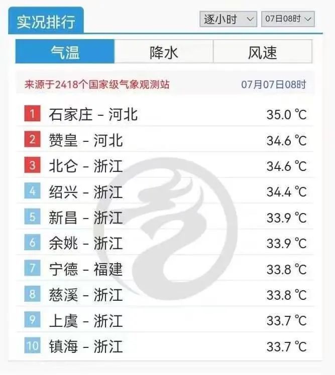 据2418个国家级气象观测站数据显示,今天8时全国气温排行榜前10位,宁波占4个,其中北仑以34.6℃位居全国第3。