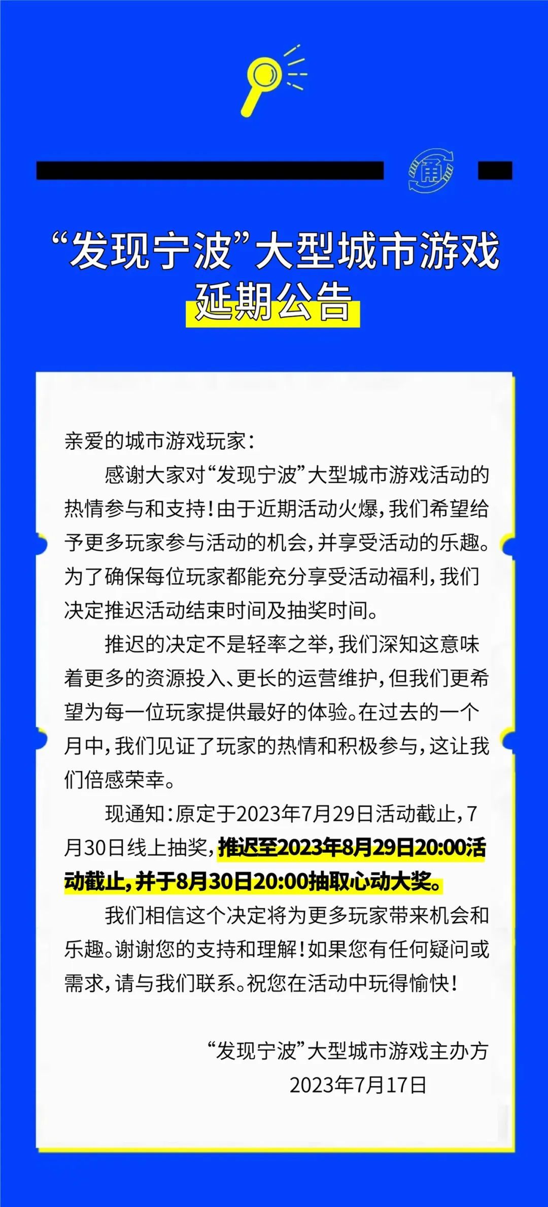 同时,关于“发现宁波”大型城市游戏,还有一则重要公告——