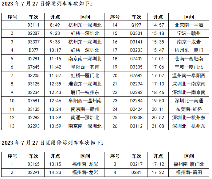 小编从铁路部门获悉,受超强台风“杜苏芮”影响,7月27日宁波站以下列车停运。一起来看↓