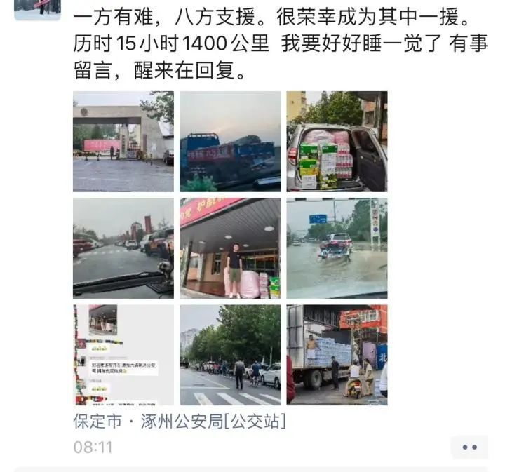 8月2日早晨8点11分,在保定市涿州公安局旁边,邓雷发布了一条朋友圈:一方有难,八方支援。很荣幸成为其中一“援”,历时15小时1400公里,我要好好睡一觉了。