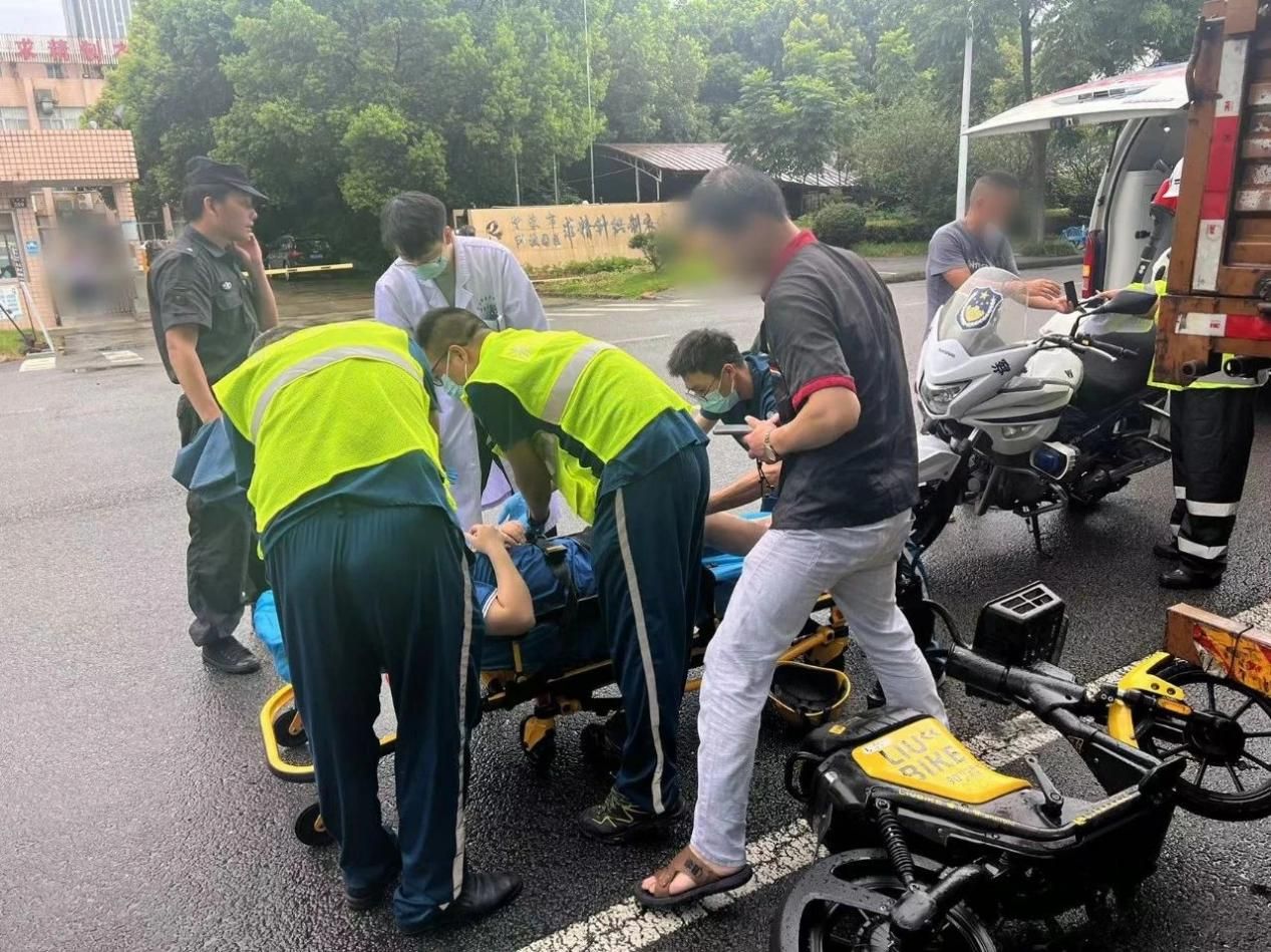 没过多久,救护车抵达现场。巡逻队员们协助医护人员将女子送上救护车,匆匆赶到现场的女子亲友对巡逻队员们表达了感谢:“下着这么大的雨,幸好有你们的及时救助,真的很感谢你们!”