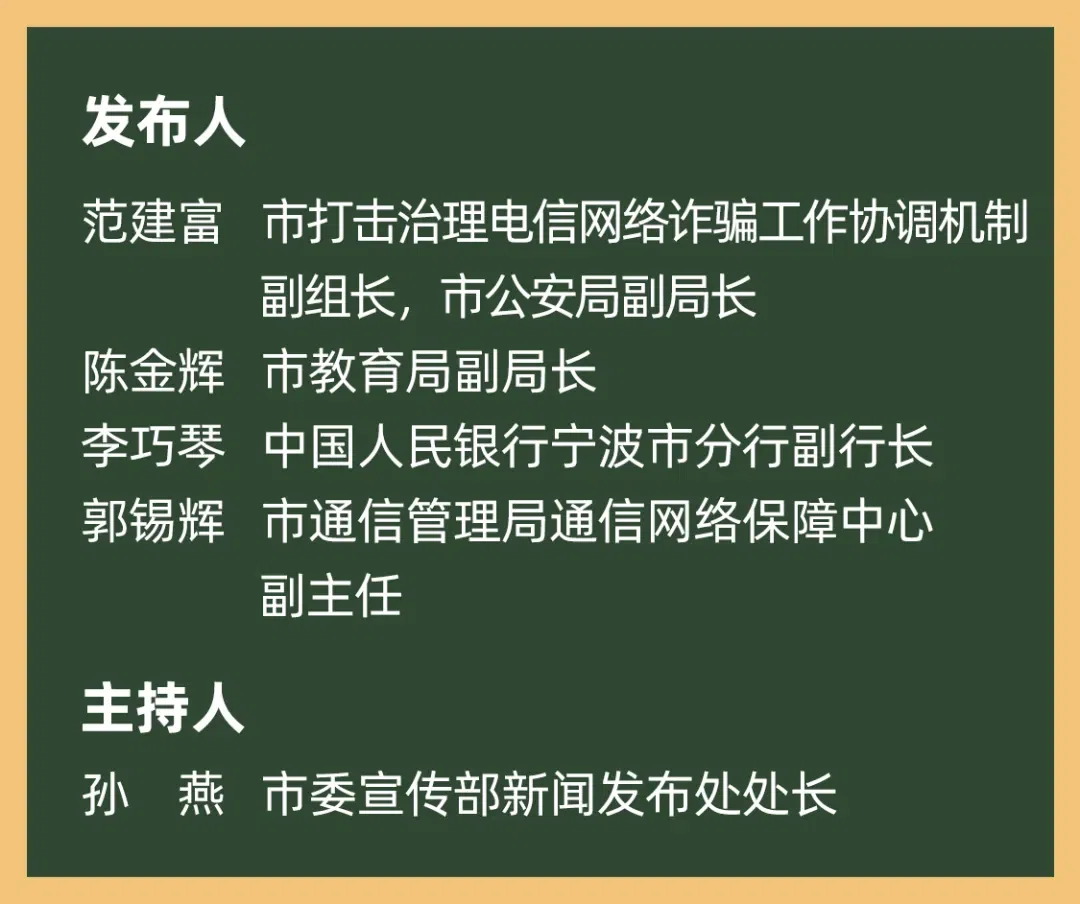 今天上午,市政府新闻办举行宁波市打击治理电信网络诈骗违法犯罪工作进展情况新闻发布会,邀请宁波市公安局、市教育局、中国人民银行宁波市分行、市通信管理局相关负责人作介绍并答记者问。
