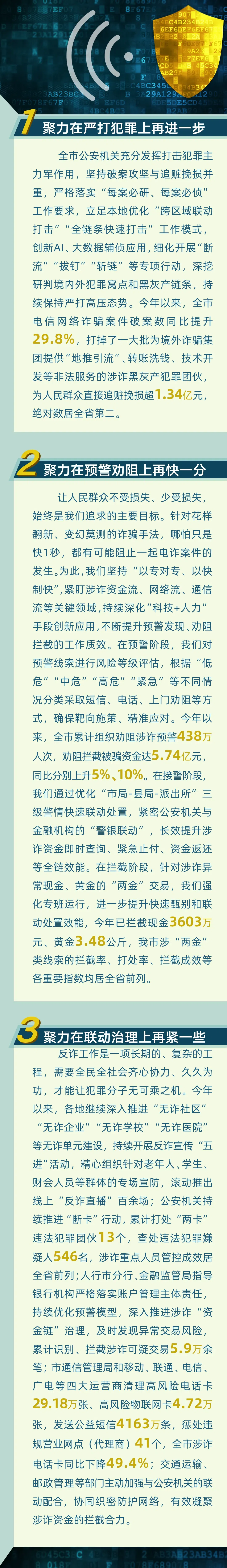 对此,全市各地各部门在市委、市政府的坚强领导下,始终将打好反诈攻坚战、持久战作为民生大事,坚持以“四专两合力”为统领,统筹推进“打防管控治宣”综合举措,同题共答、同向发力,持续巩固深化“全民反诈、全社会反诈”工作格局。
