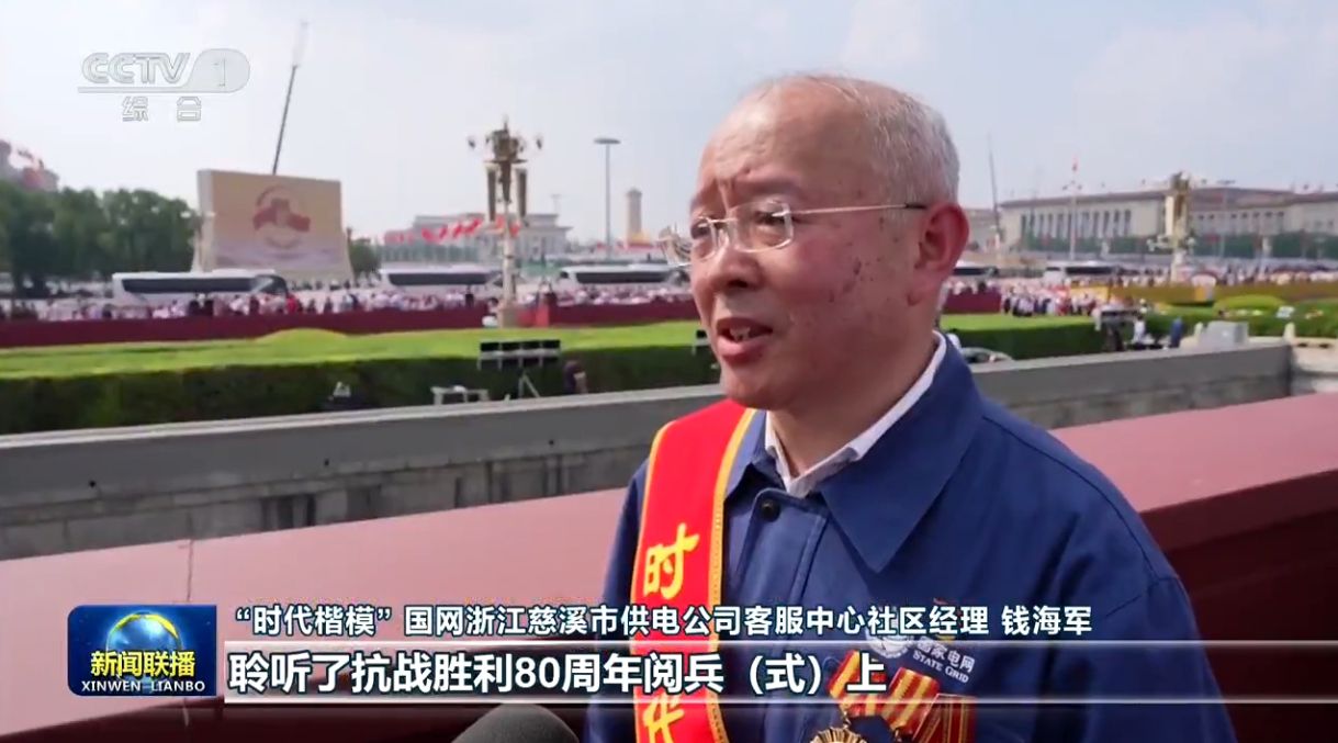 9月4日,央视《新闻联播》栏目播出《为以中国式现代化全面推进强国建设民族复兴伟业而团结奋斗——习近平总书记在纪念中国人民抗日战争暨世界反法西斯战争胜利80周年大会上的重要讲话引发热烈反响》,(视频2分48秒处)其中,“时代楷模”、国网浙江慈溪市供电公司客服中心社区经理钱海军表示,“聆听了抗战胜利80周年阅兵(式)上总书记的重要讲话,深受鼓舞。总书记说中华民族伟大复兴势不可挡。作为一名基层的产业工人,我想也拎着工具箱冲在为人民服务的第一线,去点亮‘千户万灯’,用行动践行初心使命。”