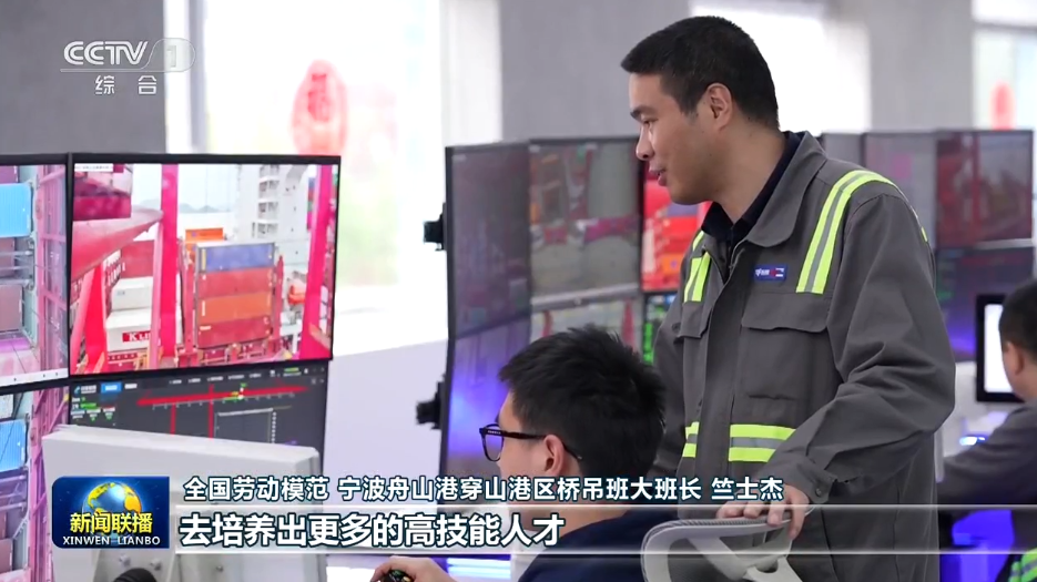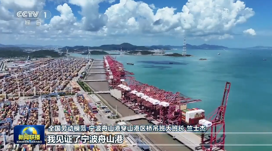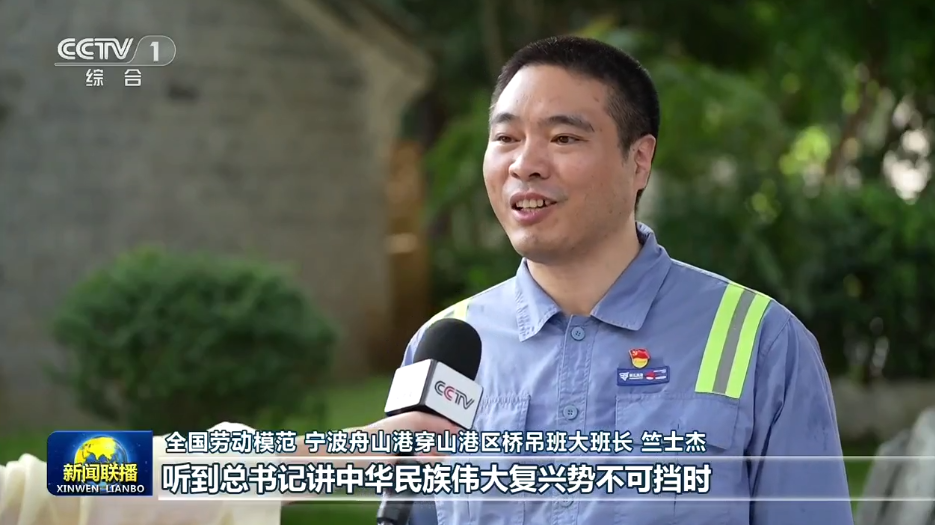 9月15日,央视《新闻联播》播出《把强国建设 民族复兴伟业不断推向前进——习近平总书记在纪念中国人民抗日战争暨世界反法西斯战争胜利80周年大会上的重要讲话引发热烈反响》,其中,(视频4分34秒处)全国劳动模范、宁波舟山港穿山港区桥吊班大班长竺士杰表示,“听到总书记讲中华民族伟大复兴势不可挡时,内心是非常激动的。我是一个码头工人,我见证了宁波舟山港从一个地方小港成长为世界第一大港,深切感受到祖国的繁荣富强。我将立足岗位,把自己的技术技能推广好,去培养出更多的高技能人才,为我们的世界一流强港建设作出贡献。”
