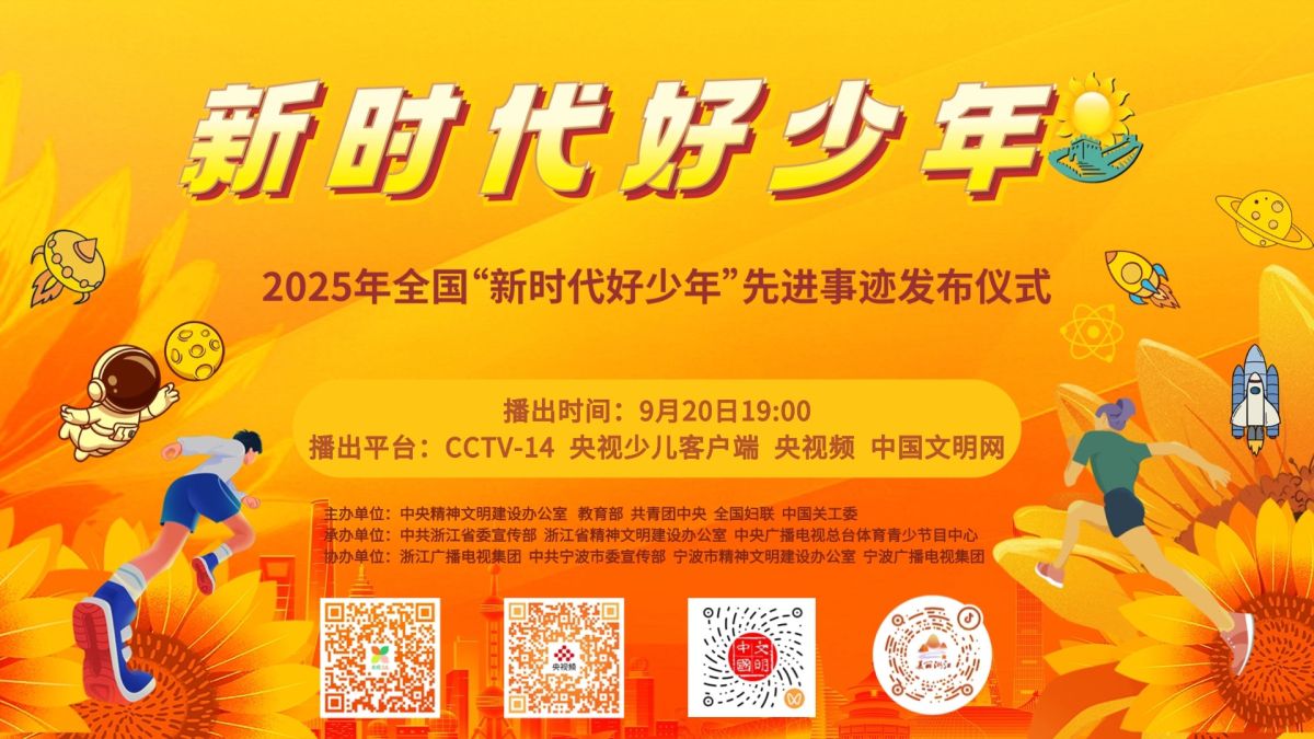 9月20日(星期六)19:00,由中央精神文明建设办公室、教育部、共青团中央、全国妇联、中国关工委联合举办的2025年全国“新时代好少年”先进事迹发布仪式将在中央广播电视总台央视少儿频道(CCTV-14)正式播出。