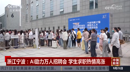 9月21日,央视《朝闻天下》《中国新闻》栏目播出《浙江宁波 AI助力招聘会 吸引近千所高校学生报名》,报道了昨天,“国聘行动”2026届毕业生首场综合招聘会暨宁波市第27届高层次人才引进洽谈会举行,吸引近千所高校学生报名参会。活动还依托数字化智能匹配系统,可以一键搜索匹配招聘岗位和用人单位所在位置。同时搭建AI求职赋能区,通过AI面试体验等服务场景,助力大学生求职全流程。