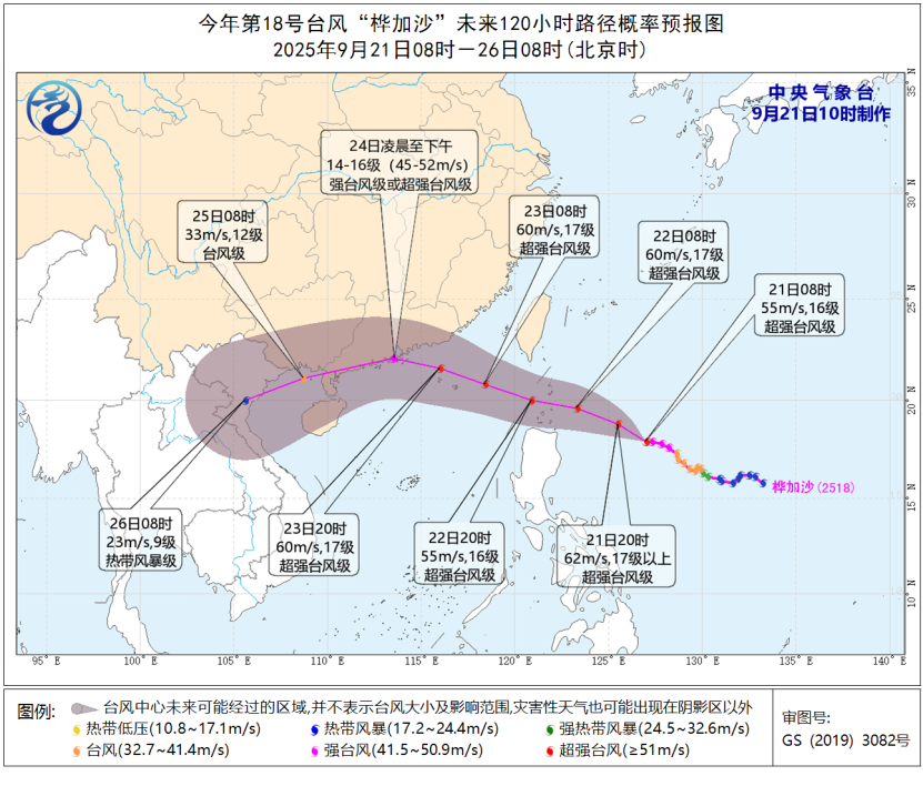 预计,“桦加沙”将以每小时15-20公里的速度继续向西偏北方向移动,强度还将有所增强,最强可达17级以上(62米/秒),9月22日穿过巴士海峡后,将于23日凌晨进入南海东北部海面,并将在24日凌晨至下午在广东沿海登陆,预计登陆时强度可达强台风级或超强台风级(14-16级,45-52米/秒)。