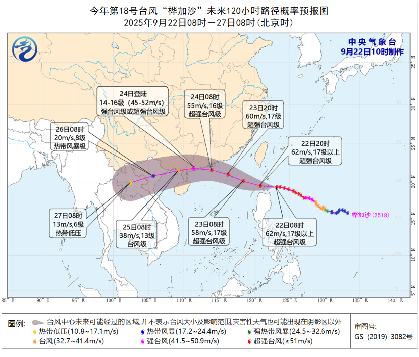 预计,“桦加沙”将以每小时20公里左右的速度向偏西方向移动,强度变化不大,穿过巴士海峡后,将于9月23日凌晨进入南海东北部海面,随后向西偏北方向移动,并逐渐向广东中西部至海南岛东北部一带沿海靠近,强度稍有减弱。