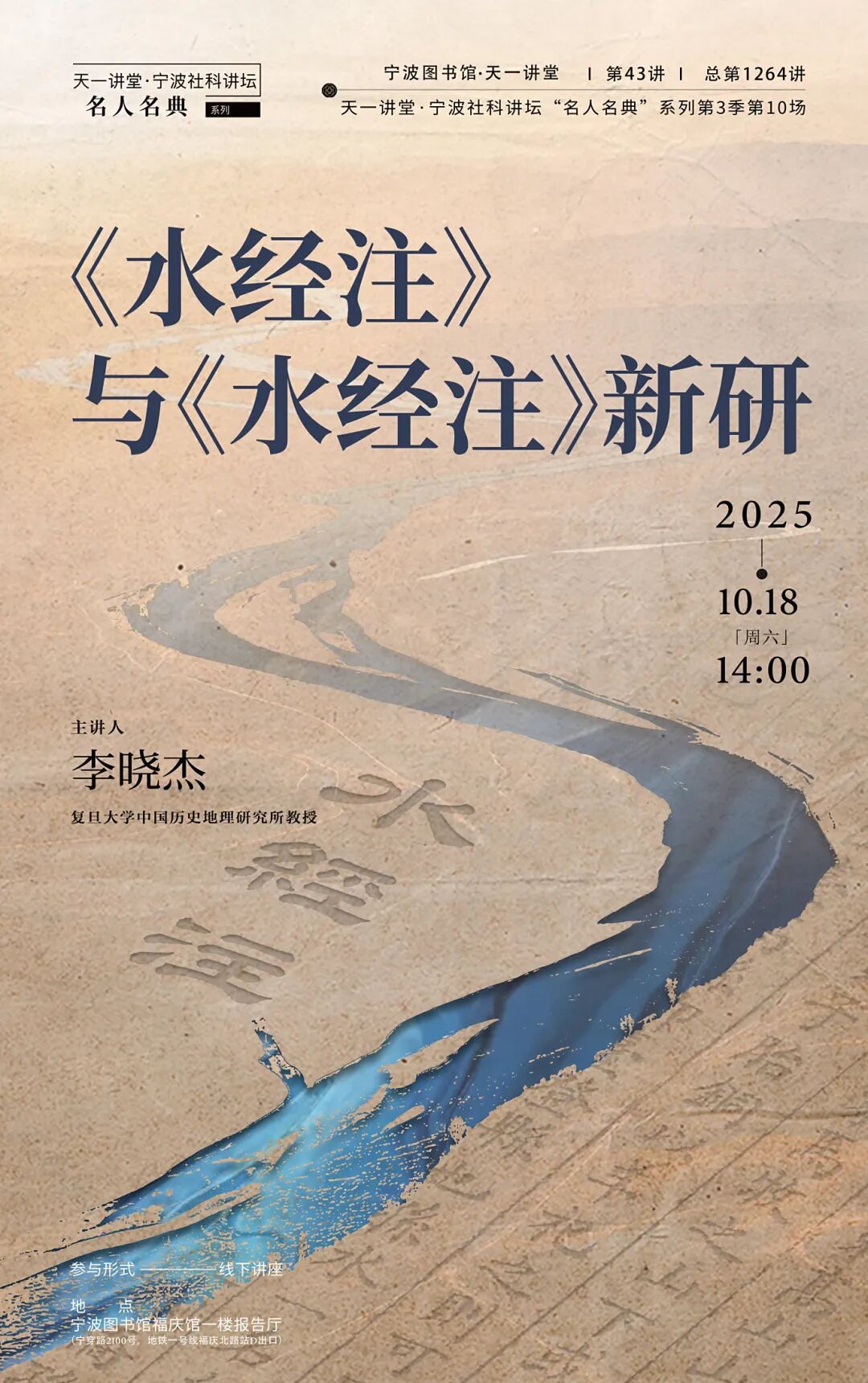 复旦大学中国历史地理研究所教授李晓杰,将就古代地理名著《水经注》的历史价值及其与宁波之间的深厚渊源,和甬城读者进行一次面对面的分享。
