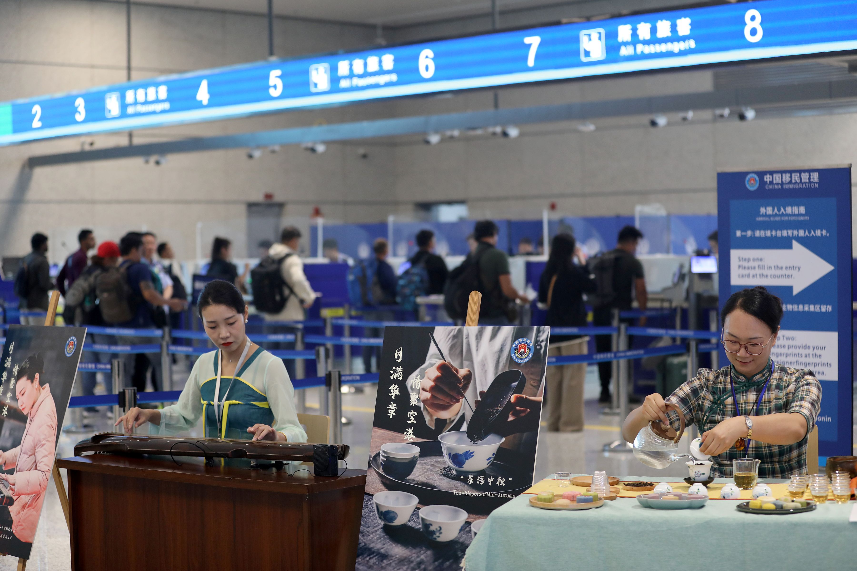 与此同时,一场精彩的文化体验活动正在入境大厅展开。古筝演奏《明月几时有》的悠扬旋律回荡在大厅内,让中外旅客驻足欣赏。在传统文化体验区,外籍旅客在首南街道学府社区网格员的协助下,尝试制作“福”字香篆,体验茶艺表演,深入了解中秋节的文化内涵。