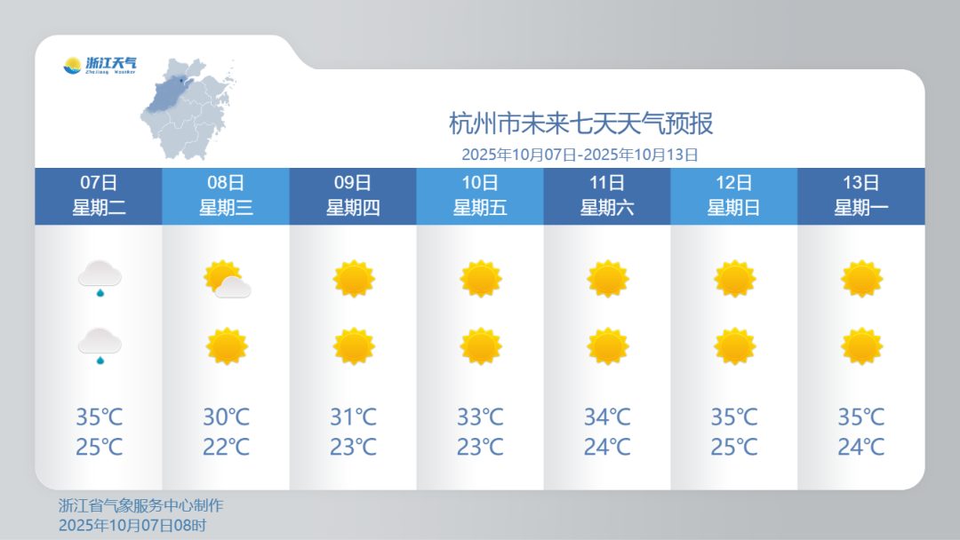 “历史上,我省最迟高温出现在10月11日,今年预计10月11~13日部分地区还会出现高温,十分罕见。”毛燕军说,省会杭州已经打破了当地最晚高温日纪录,未来几天这项纪录还将继续刷新。再点名衢州、丽水,高温天气不间断,最高气温或达37℃左右。