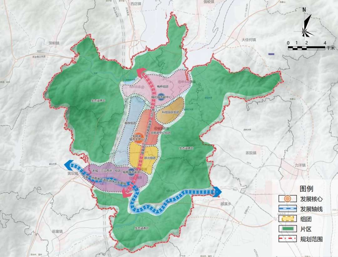 根据《规划》,构建“一主两副、两轴六组团”的中心城区空间结构,统筹中心城区居住生活、基础设施、公共服务、产业发展、生态保护等要素布局,打造富有历史文化底蕴、现代发展活力、生态环境卓越的山水宜居城市。