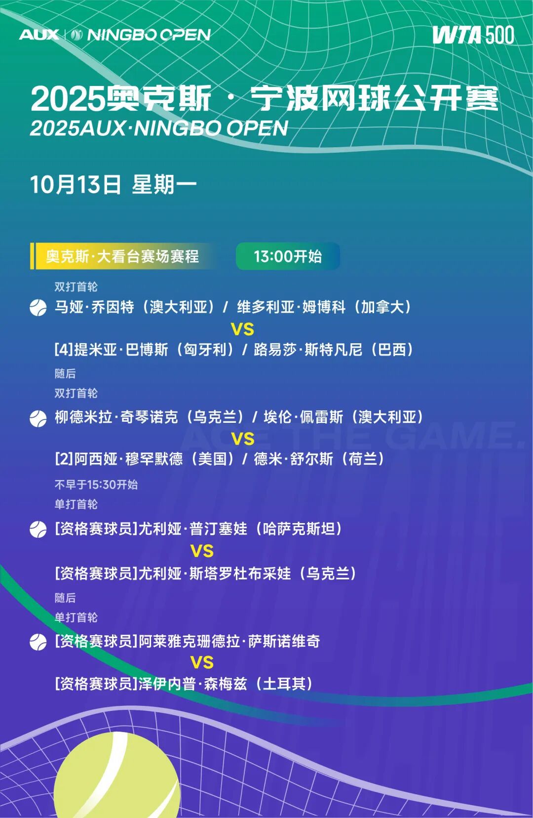 2025奥克斯·宁波网球公开赛由国家体育总局网球运动管理中心、宁波市人民政府主办,宁波市体育局、鄞州区人民政府承办,鄞城集团惠风体育执行运营,宁波市体育交流与竞赛中心协办。比赛地点在宁波(鄞州)网球中心。单双打正赛时间为10月13日-19日。购票平台:久事体育APP。