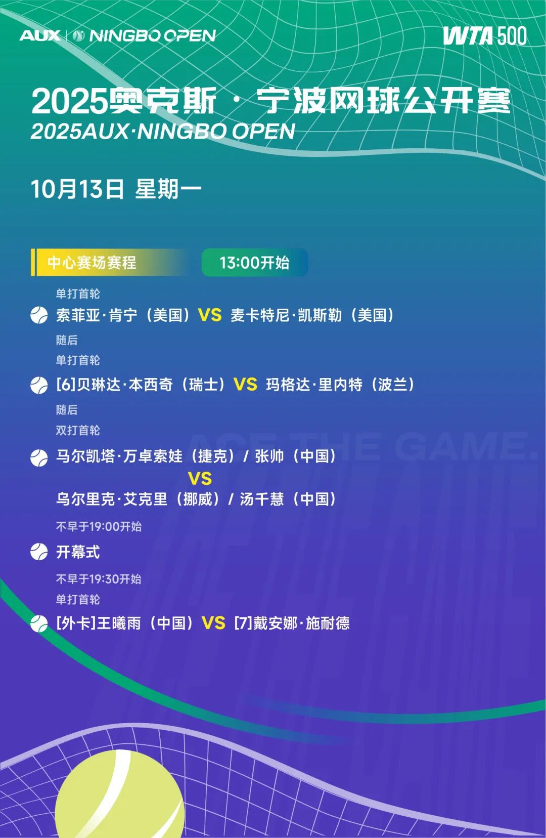 10月13日的中心赛场好戏连台,下午1点,前澳网冠军肯宁率先登场,她将和凯斯勒上演一场美国德比,这将是双方首次交手。随后,东京奥运会女单金牌得主、今年温网四强本西奇将要对阵波兰名将里内特,交手记录本西奇1-0领先。接下来,张帅/万卓索娃强强联手,将在女双第一轮迎战汤千慧/艾克里。