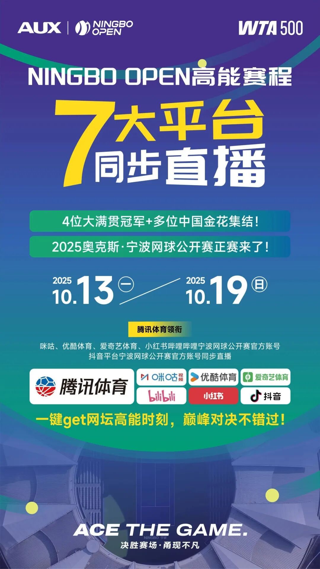 2025奥克斯·宁波网球公开赛由国家体育总局网球运动管理中心、宁波市人民政府主办,宁波市体育局、鄞州区人民政府承办,鄞城集团惠风体育执行运营,宁波市体育交流与竞赛中心协办。比赛地点在宁波(鄞州)网球中心。单双打正赛时间为10月13日-19日。购票平台:久事体育APP。