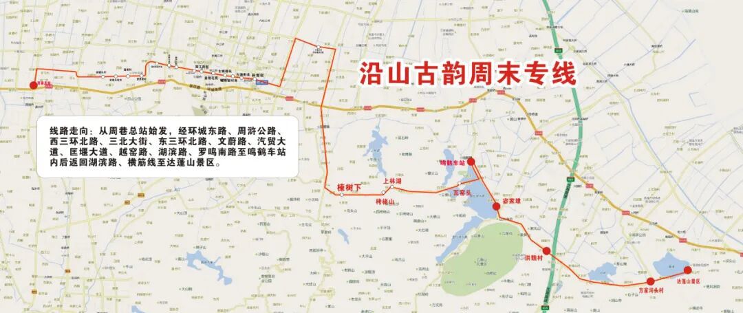 线路走向:从周巷总站始发,经环城东路、周浒公路、西三环北路、三北大街、东三环北路、文蔚路、汽贸大道、匡堰大道、越窑路、湖滨路、罗鸣南路至鸣鹤车站内后返回湖滨路、横筋线至达蓬山景区。