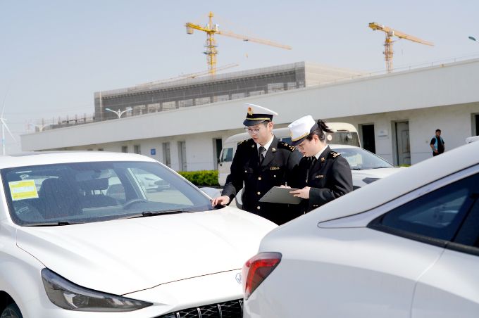 宁波海关关员对即将出口的汽车进行现场监管。应俊 摄