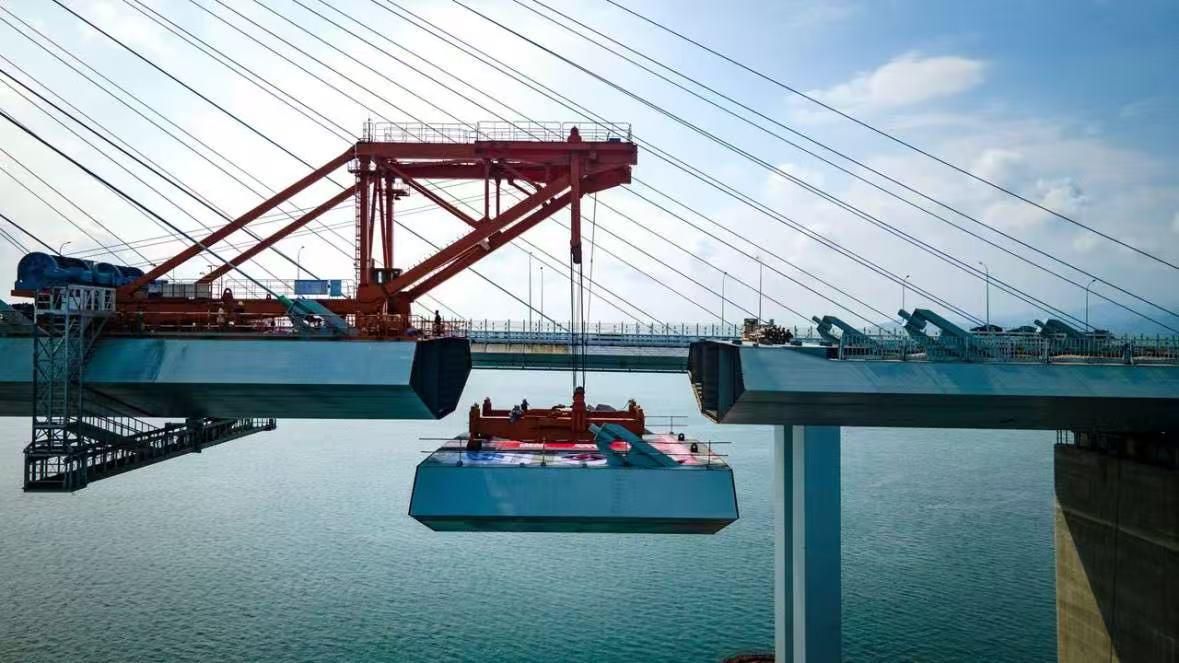 据陈正东介绍,大桥主桥共需架设95片钢箱梁,目前已完成80片,剩余15片位于中跨主通航孔上方。随着双侧边跨合龙,工程项目也将迎来最关键的中跨梁段架设冲刺期。