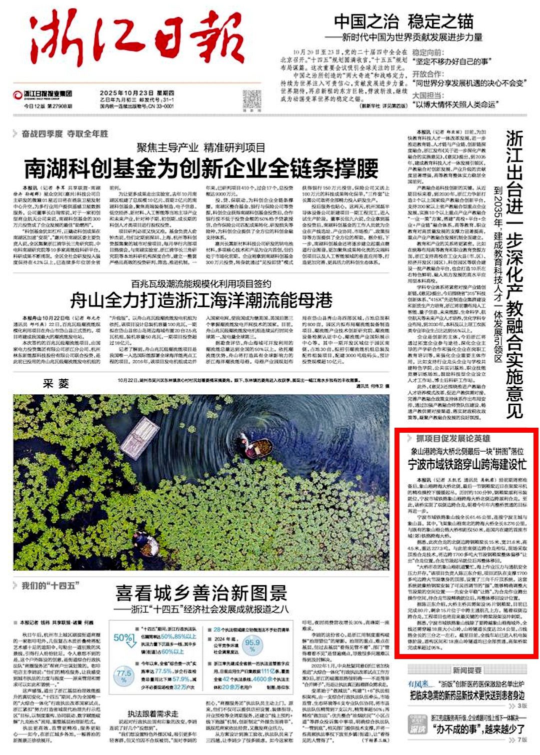 经前期周密准备后,象山港跨海大桥北侧,最后一节钢箱梁近日在架梁吊机的精准操控下缓缓起吊。历时约100分钟,钢箱梁顺利吊装就位,宁波市域铁路象山港跨海大桥北侧边跨顺利合龙。至此,该桥实现了双侧边跨合龙,朝着今年年内整桥贯通的目标再进一步。