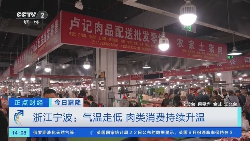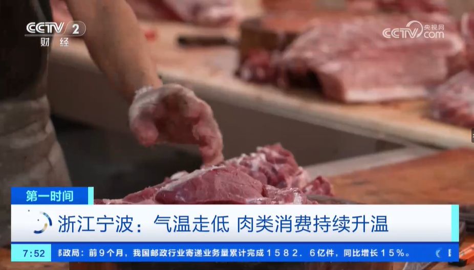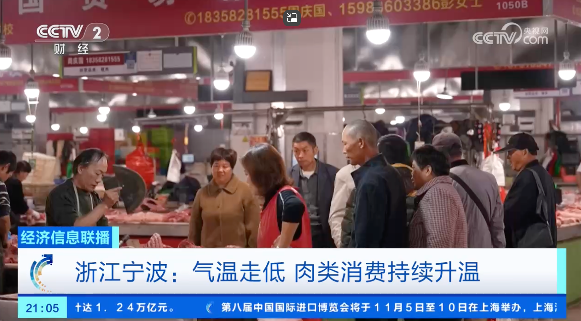 10月23日,央视《天下财经》《正点财经》《中国三农报道》《经济信息联播》《第一时间》栏目播出《浙江宁波:气温走低 肉类消费持续升温》,报道了随着气温走低,这几天宁波部分农贸市场肉类消费持续升温,同时火锅经济也为肉市添“一把火”。