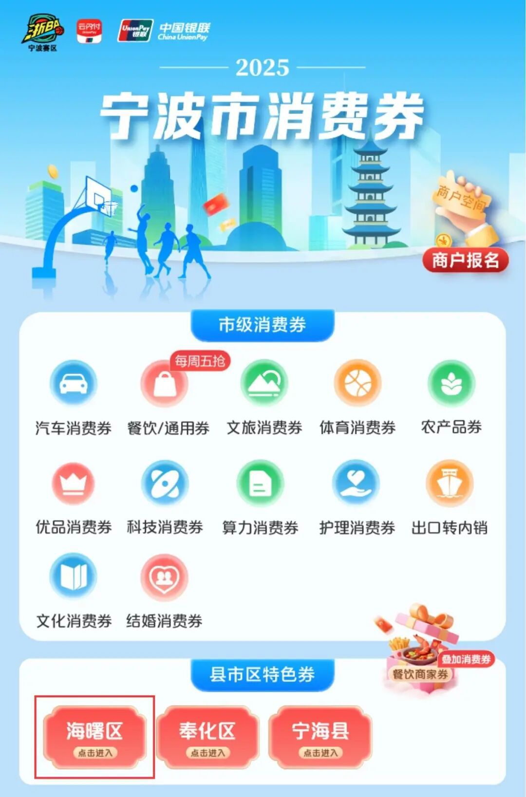 2025年10月24日至29日每天10:00,在云闪付【市县消费券】-【海曙区】进入活动专题页领券参与活动。每活动日发券数量有限,先到先得。
