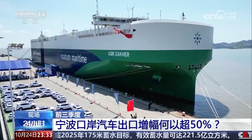 10月24日、25日,央视《24小时》《新闻直播间》栏目播出《前三季度 宁波口岸汽车出口增幅何以超50%?》,报道了海关最新数据显示,今年前三季度,长三角地区出口汽车252.5万辆,同比增长30.4%,其中宁波口岸出口汽车同比增长53.3%,增幅居长三角地区首位。那么,宁波口岸的汽车出口为什么能出现这么大的涨幅呢?一起点开文首视频,来看央视记者在宁波的报道。